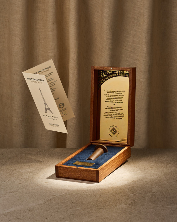 Born at the heart of the 1889 World’s Fair, Gustave Eiffel’s masterpiece owes its airy silhouette to the assembly of millions of hot-forged rivets. These small metal pieces, hammered by teams of riveters working in perfect harmony, gave life to the iconic structure admired around the world today. This official re-edition pays tribute to that founding gesture and to a craft tradition that has endured through the decades.