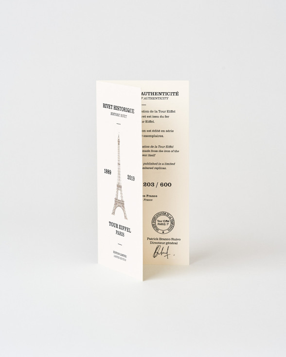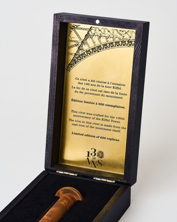 Delivered in a beautiful wooden box, with certificate of authenticity. The Société d'Exploitation de la tour Eiffel certifies that this rivet is made from Eiffel Tower iron deposited during renovation campaigns in the 20th century.