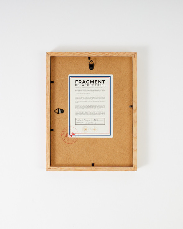 Cette feuille unique provient des jardins au pied de la tour Eiffel. À travers l'arbre dont elle est issue, elle constitue un authentique e témoin vivant et silencieux de l'histoire des lieux.