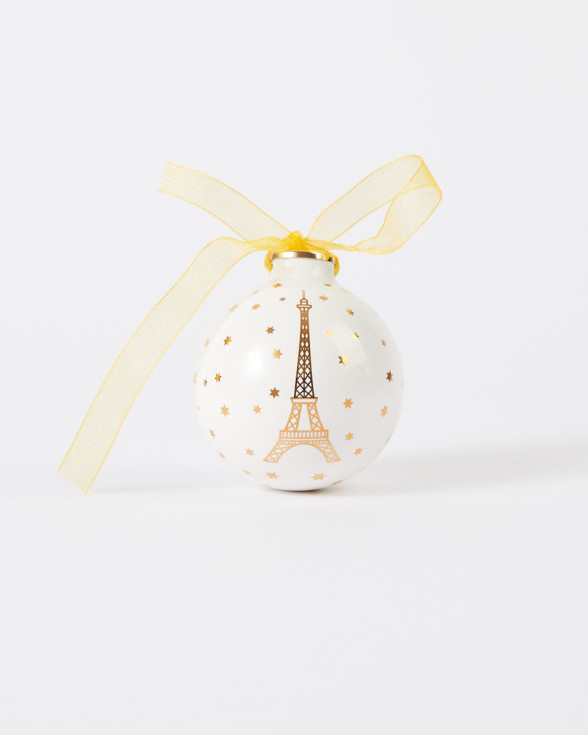 Faite à la main en céramique de haute qualité, chaque boule de Noël est émaillée en blanc lumineux et embelli d'un logo de la tour Eiffel en doré, ajoutant une touche de luxe à votre sapin. Le savoir-faire artisanal garantit que chaque pièce est unique, avec de légères variations qui ajoutent à son charme spécial. Cette boule de Noël est non seulement un ornement superbe mais aussi un souvenir durable de Paris. Elle est équipée d'un cordon doré, prête à être suspendue et à briller parmi vos décorations de fête.